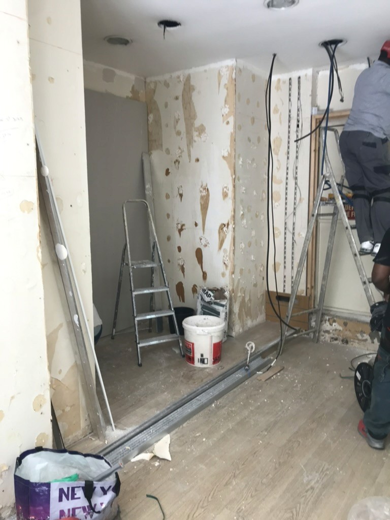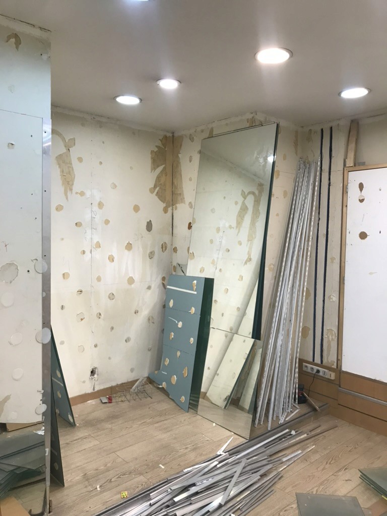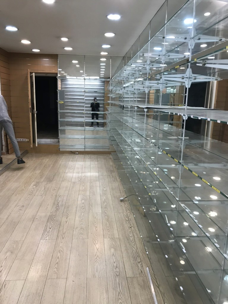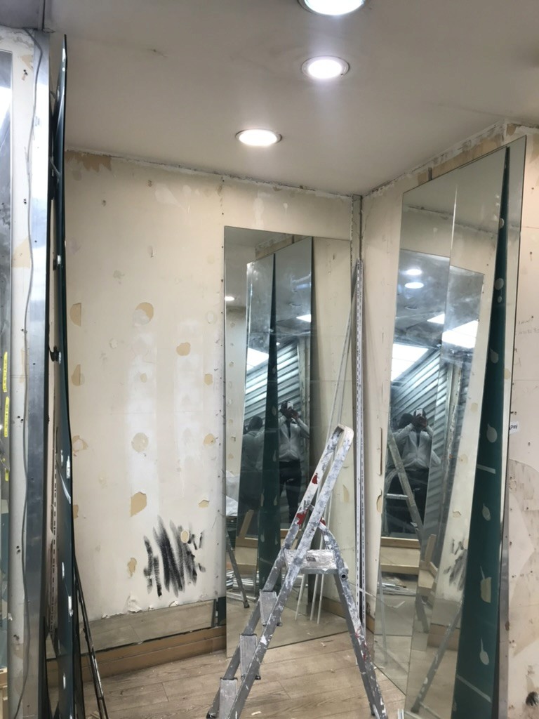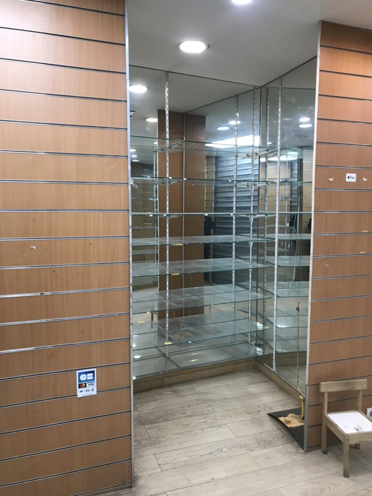 Dépose complète des aménagements intérieurs de l’ancienne boutique (étagères, vitrines, faux plafonds, revêtements muraux et sols).